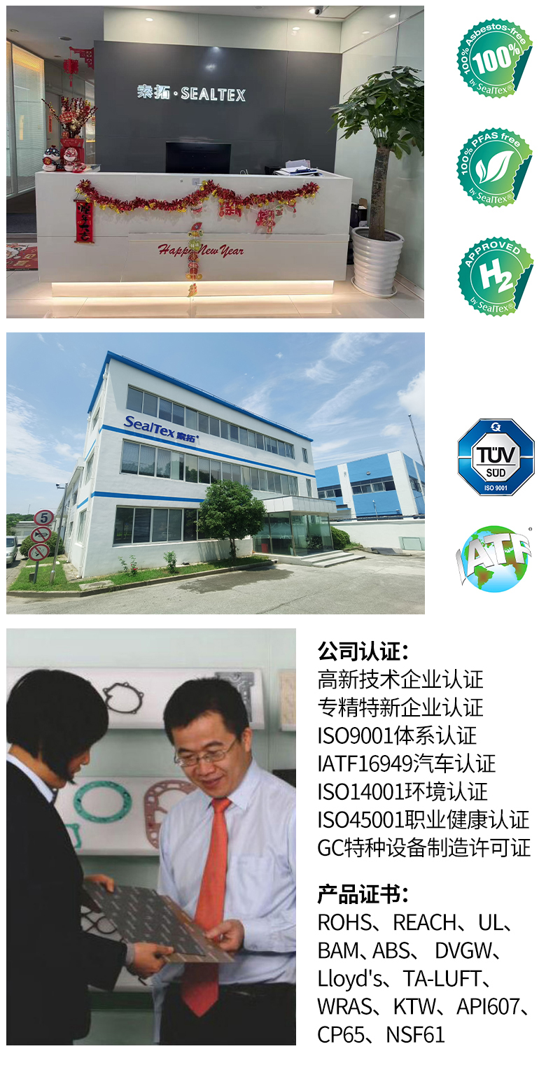 SealTex索拓密封可提供各種膨體四氟及改性四氟密封墊、壓縮纖維橡膠密封墊、軟木橡膠密封墊、石墨金屬復(fù)合增強墊片、植物纖維耐油紙墊、耐高溫云母復(fù)合密封墊、金屬涂覆密封墊RCM等。常見材料型號ST-2067、ST-4376、ST-2058、ST-3150、ST-9926、ST-3263等廣泛應(yīng)用于汽車、暖通空調(diào)、造船、海工、石油化工、核電、醫(yī)藥食品、新能源等各種工業(yè)領(lǐng)域。并有RoHS、REACH、UL、SVGW、DVGW、TSCA、CP65、ELV、PFAS-free、EN45545-2、FDA、BAM、TA-Luft、API607、ABS、GL、WRAS、NSF61、ACS、KTW、ELL、KTW-BWGL、TZW W270、FIRE-SAFE防火認證等證書。可提供API622、ISO15848-1及FDA認證的盤根填料;各種盤根及墊片切割工具。提供各種特殊尺寸的輥壓板如2000X2000mm、3000X3000mm、1500X4500m。密封墊厚度從0.15mm起.