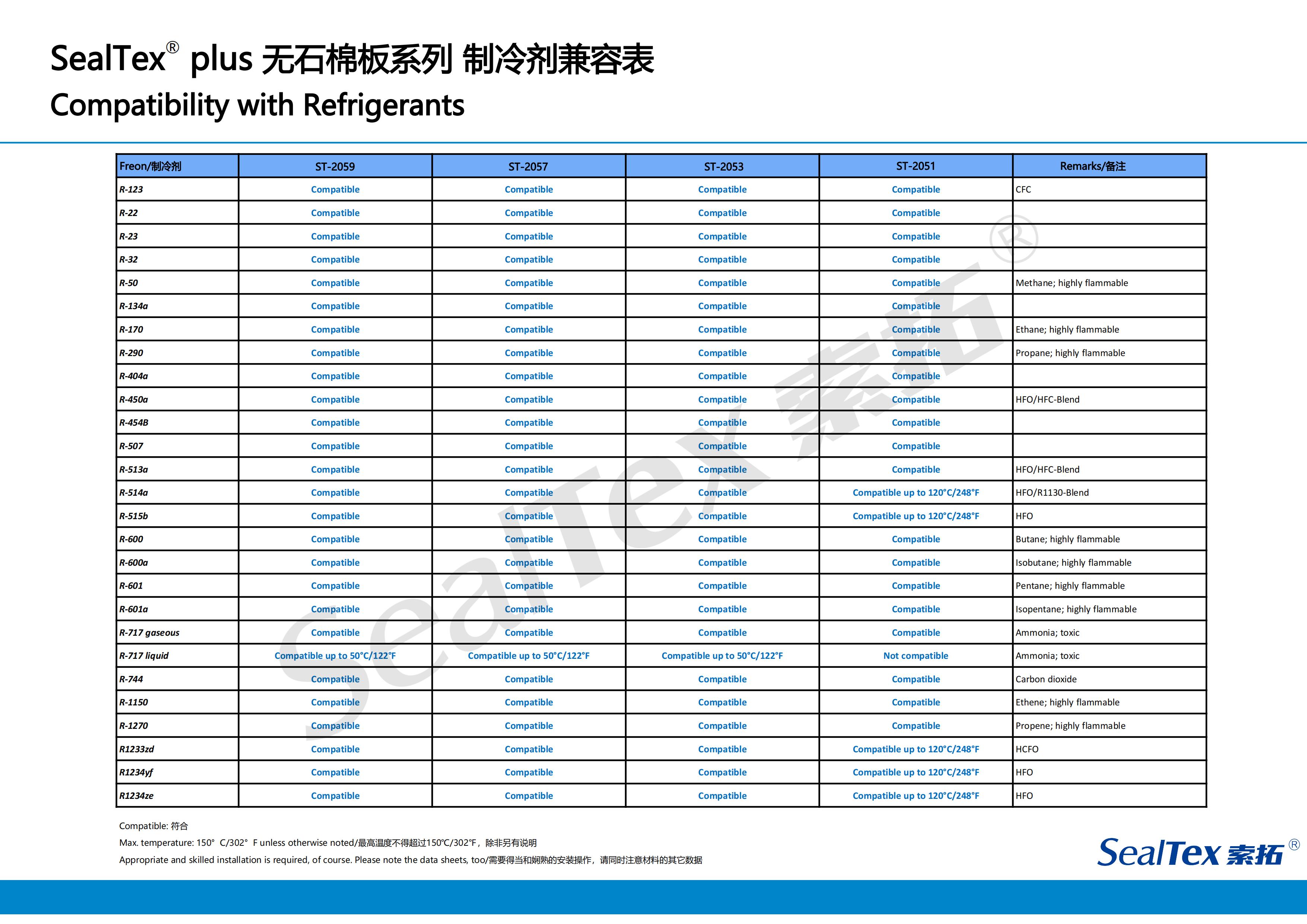 對于密封式和半密封式制冷壓縮機(jī)來說,每類制冷壓縮機(jī)可能會(huì)用到不同的制冷劑,一個(gè)能完全遏止制冷劑的可靠性密封系統(tǒng)是決定壓縮機(jī)長期穩(wěn)定運(yùn)轉(zhuǎn)的重要因素。SealTex索拓公司為滿足制冷壓縮機(jī)用戶的要求,特別推出能在各種法蘭壓力下保持卓越密封性能的無石棉密封材料以滿足市場的需求。這些產(chǎn)品非常適用于半密封式壓縮機(jī)、冷卻裝置,對螺桿式和往復(fù)式壓縮機(jī)的應(yīng)用尤其適合。例如:ST-2059、ST-2057ST-2053ST-2051.